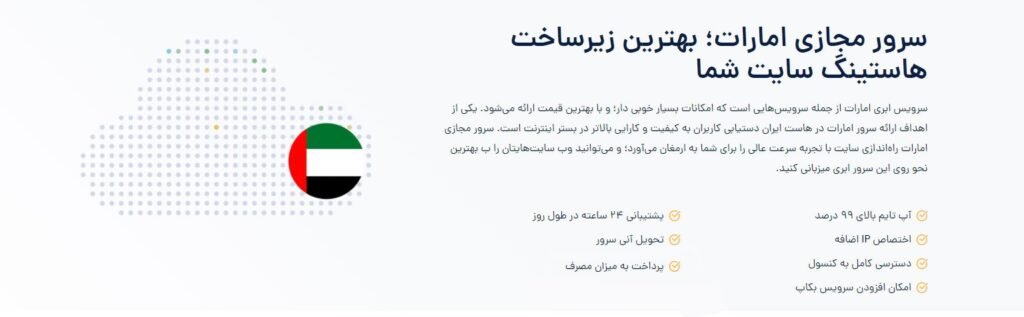 با مطالعه این مطلب ضمن آشنایی با هاست ایران به عنوان یکی از بهترین شرکتهای ارائه دهنده سرور مجازی ایرانی و خارجی، با کاربردها و ویژگیهای سرور مجازی امارات نیز آشنا شدید. سرور مجازی امارات یکی از جدیدترین سرویسهای میزبانی وب در هاست ایران است که با پشتیبانی ۲۴ ساعته و امکان ارتقاء لحظهای به کاربران ارائه میشود. در هر زمان که به منابع بیشتری احتیاج داشته باشید، در کمترین زمان و با چند کلیک ساده به منابع مورد نیاز خود دسترسی خواهید داشت. چه چیزی از این بهتر؟ منتظر چه هستید؟
